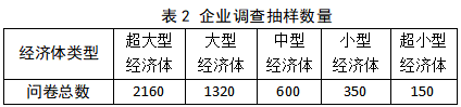 行業(yè)分層:企業(yè)調(diào)查覆蓋全部制造業(yè)和全部服務業(yè),包括所有制造業(yè)、建筑業(yè)、批發(fā)零售業(yè)、交通運輸業(yè)和倉儲業(yè)、酒店和住宿業(yè)、信息傳輸業(yè)、律所會計師等科技服務業(yè)、維修行業(yè)。農(nóng)業(yè)、開采業(yè)和銀行業(yè)不在企業(yè)調(diào)查范圍之內(nèi)。 規(guī)模分層:企業(yè)規(guī)模將覆蓋大型企業(yè)、中型企業(yè)、小型企業(yè)。 (三)抽樣數(shù)量 每個分層中將抽取具有代表性的樣本,每個區(qū)域的抽樣數(shù)量并非固定,六個區(qū)域內(nèi)也非均勻分布,對于某些產(chǎn)業(yè)活動單位數(shù)目較多的省份,將會通過調(diào)整權重方式進行校正。不同的經(jīng)濟體的總樣本數(shù)如表2所示。中國作為超大型經(jīng)濟體的總體樣本數(shù)是2160份。