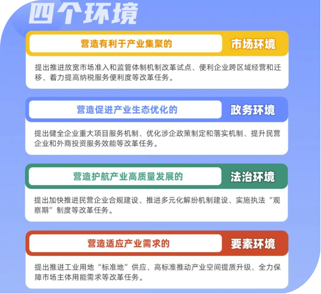 廣州市:推出“產業版”營商環境改革舉措 2023年8月,廣州市人民政府印發《廣州市建設國際一流營商環境標桿城市 助力產業高質量發展行動方案》,標志著廣州營商環境改革進入6.0版本。在1.0-5.0改革持續深耕減環節、減時間、減成本、優服務“三減一優”便利化改革的基礎上,6.0改革堅持“大營商”視野,進一步拓展改革的廣度和深度,著力營造有利于產業集聚的市場環境、適應產業需求的要素環境、促進產業生態優化的政務環境,以及護航產業高質量發展的法治環境,重點瞄準企業特別是制造業企業在用地、用工、融資、用能等方面的迫切需求,提供總量充足、結構合理、成本可控的要素保障,著力優化可量化并體現為企業綜合成本的全要素營商環境。