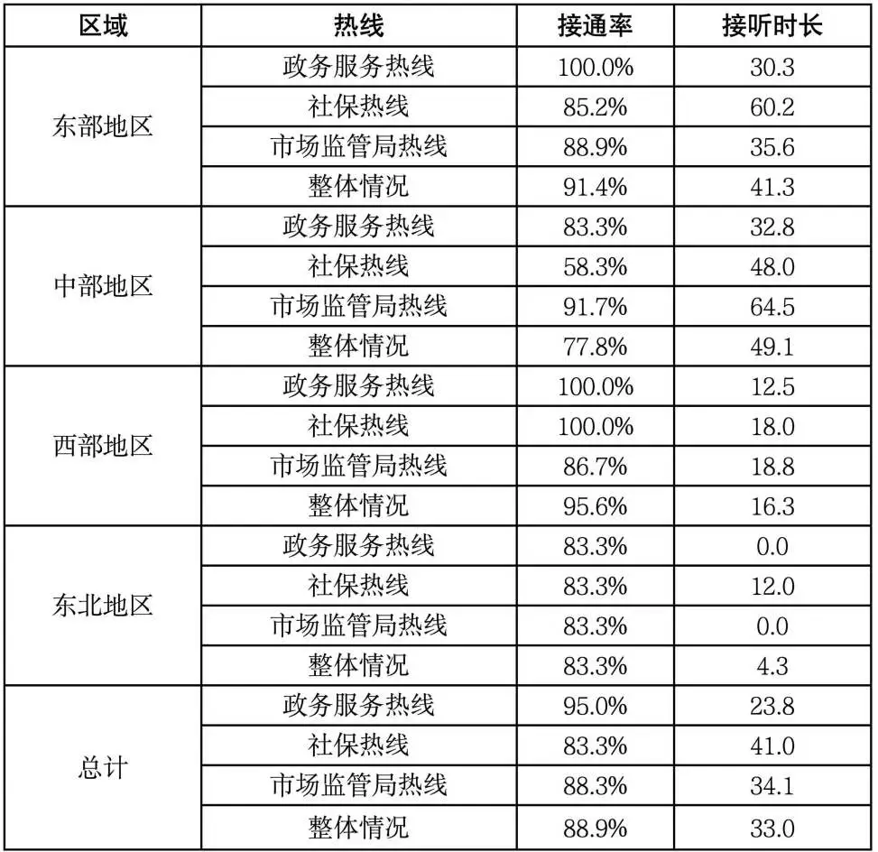 整體接通比例較高,接通方式多樣。總體來看,調(diào)研城市近90%的咨詢熱線可接通,平均等待時(shí)長為30-40秒,接通方式主要采用“人工服務(wù)”“智能語音+人工服務(wù)”和“智能咨詢”三種。其中,我國東部、西部、東北地區(qū)咨詢熱線接通率普遍較高,政務(wù)服務(wù)熱線接通率較高,社保熱線接通率相對(duì)較低。仍存在部分地區(qū)咨詢熱線公示號(hào)碼錯(cuò)誤、空號(hào)、停機(jī)的情況,部分熱線接通等待時(shí)間較長或無人接聽。