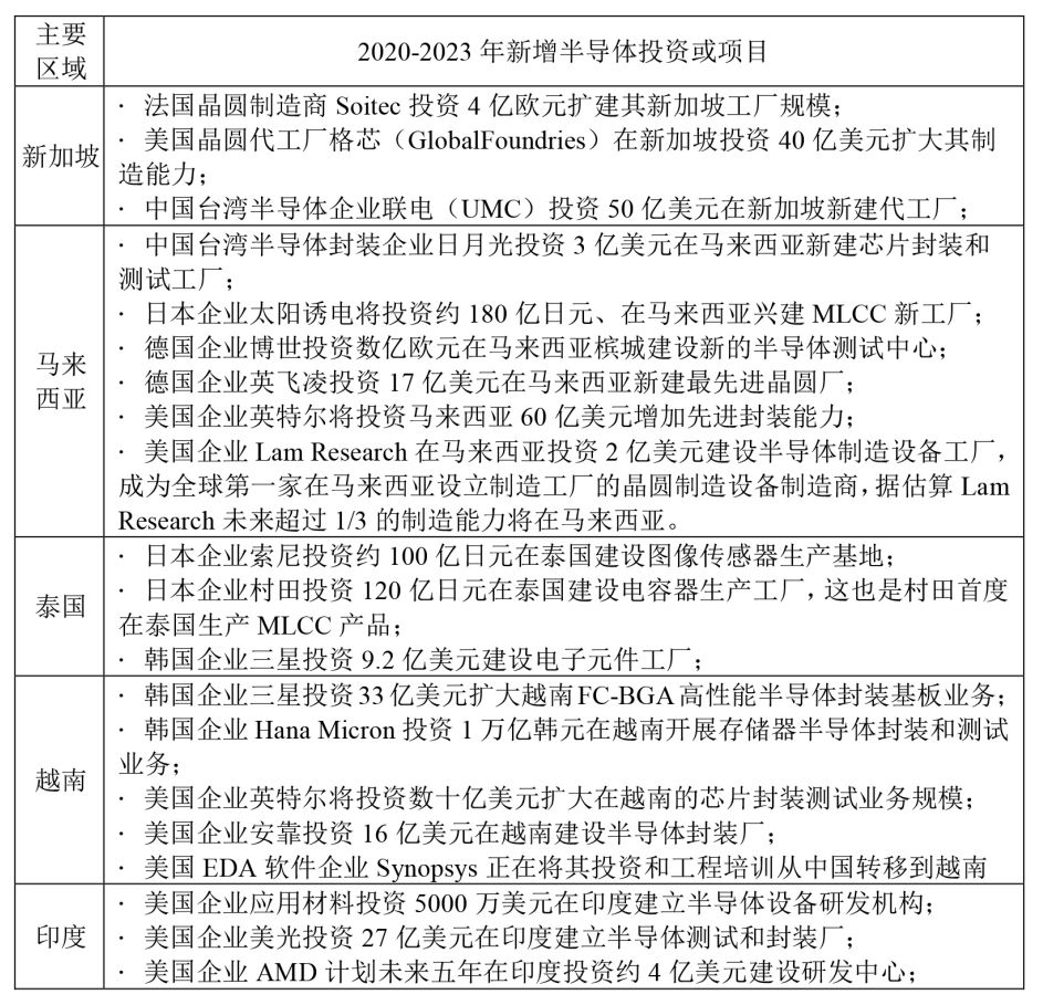 全球半導體產業集中在美國、中國大陸、歐洲、日本、韓國和中國臺灣六大區域,據相關數據顯示,2022年六大區域半導體產值占比超過98%。而新加坡、馬來西亞等地,雖然也有半導體產業的布局,但普遍處于產業鏈中低端,例如全球15%-20%的被動元件產能布局在東南亞。近年來由于中美半導體貿易脫鉤加劇,國際地緣沖突等因素作用,進一步催化全球半導體產業鏈分流和遷移,新加坡、馬來西亞、泰國、越南和印度等半導體“二線”區域正從半導體行業的全球布局調整中受益匪淺。主要特征:①美國、歐洲等國家和地區企業均以提高供應鏈在面對國際地緣政治緊張局勢時的彈性為由,持續加大在新加坡等地的投資(見表3)。②根據Gartner的預測,2021-2027年亞太地區(除日韓、中國的大陸和臺灣地區外)的半導體產業收入的年均復合增速將超過中國臺灣、美國、歐洲、中國大陸、日韓等傳統半導體“一線”區域,成為未來5年全球增長最快的區域(見表4)。