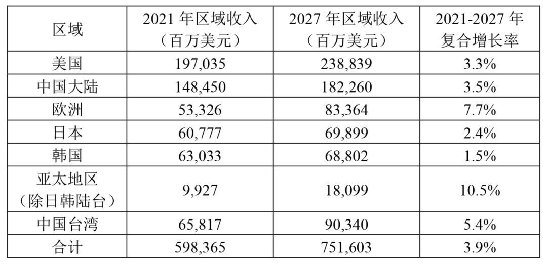 表4:2021-2027年全球半導體產業收入區域分布預估