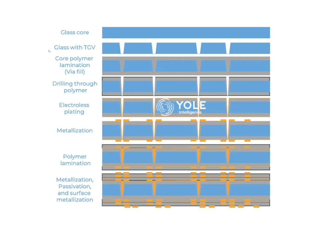 硅通孔工藝(TSV)是目前實現三維異構集成的主流先進封裝技術之一。TSV主要通過銅等導電物質的填充完成硅通孔的垂直電氣互連,減小信號延遲,降低電容、電感,實現芯片的低功耗、高速通信,增加帶寬和實現器件集成的小型化需求。但由于硅基板存在成本高和電學性能差的問題,業界認為基于玻璃基板的TGV(Through Glass Via,玻璃通孔)技術可作為一種替代TSV的封裝技術。TGV通過在玻璃基板中制作通孔并填充導電材料,實現芯片間的高速連接,對于提升封裝密度和性能具有重要意義。
