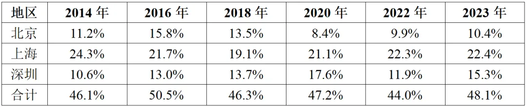 表6 2014-2023年北京、上海、深圳集成電路設(shè)計(jì)、制造、封測(cè)三大主業(yè)銷售收入占全國比重情況