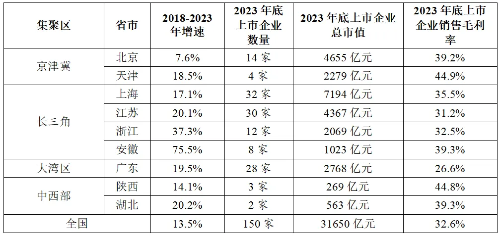從企業(yè)發(fā)展來看,京津冀和中西部上市企業(yè)發(fā)展較為優(yōu)質(zhì),中西部上市企業(yè)數(shù)量和總市值仍有上升空間。根據(jù)東方財(cái)富數(shù)據(jù)(表9),截止到2023年底,在我國150家半導(dǎo)體上市企業(yè)中,82家來自長(zhǎng)三角地區(qū),占比接近一半,總市值占比也接近一半。而京津冀和中西部上市企業(yè)的銷售毛利率遠(yuǎn)超國內(nèi)全行業(yè)上市企業(yè)平均水平,企業(yè)質(zhì)量較為優(yōu)質(zhì)。但中西部地區(qū)的上市企業(yè)數(shù)量和總市值與其他地區(qū)存在較為明顯的斷層差距,仍存在一定的上升空間。