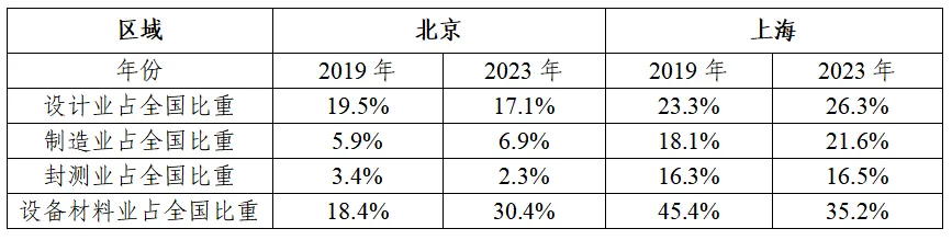 表3 2019年和2023年北京、上海的集成電路產業各環節占全國比重的對比(億元)