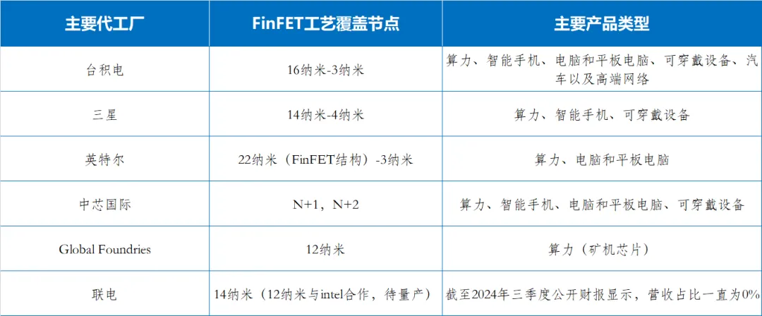 表1 全球主要代工廠FinFET工藝覆蓋節(jié)點(diǎn)和主要產(chǎn)品