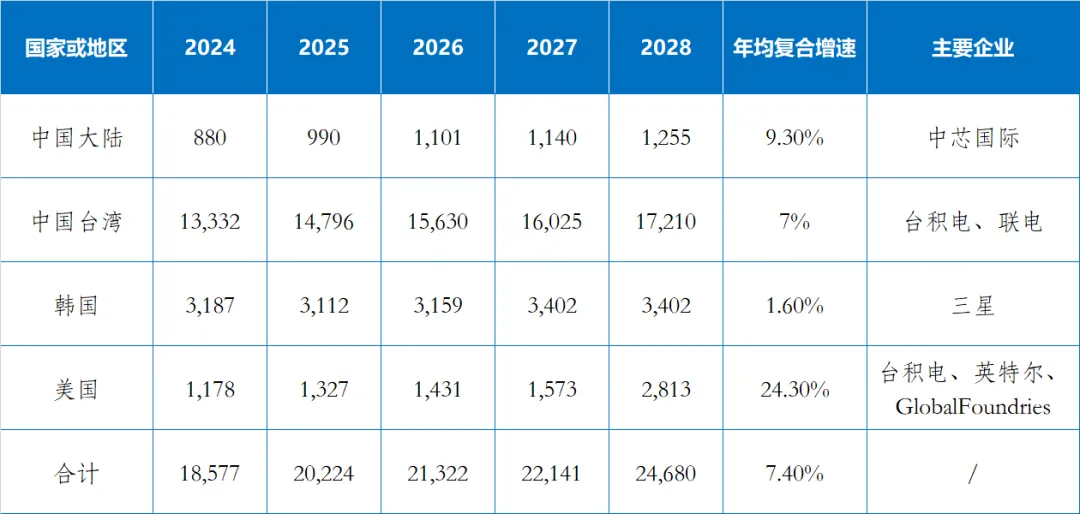 表2 2025-2028年全球FinFET工藝分布及所在區(qū)域的主要企業(yè)(等效8英寸晶圓月產(chǎn)能/千片)