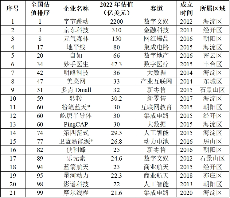 表1 2022年全國估值前100的北京獨(dú)角獸企業(yè)