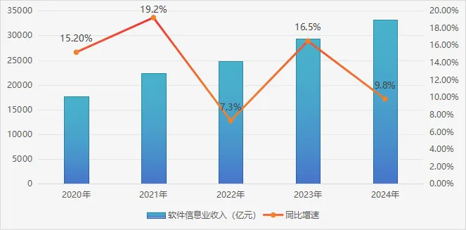 “十四五”以來,北京信息軟件業保持高速增長,成為全市經濟高質量發展的核心支撐。2021年北京信息軟件業1實現收入2.2萬億元,2024年收入突破3.3萬億元,僅用三年時間再邁上一個萬億級臺階,占全國信息軟件業比重近四分之一。2024年,北京信息軟件業實現增加值11068.8億元,同比增長11.0%,占地區生產總值的22.2%,成為全市經濟的第一支柱。