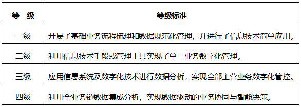 2022年10月,工業和信息化部發布了《中小企業數字化水平評測指標》,從數字化基礎、經營、管理和成效四個維度評估中小企業數字化水平,將數字化水平劃分為四個等級[1](表1)。