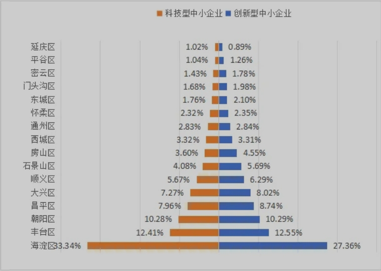圖1 北京市科技型中小企業和創新型中小企業區域分布 2.兩類企業培育導向基本一致,創新型中小企業指標體系覆蓋面更廣。 科技型中小企業和創新型中小企業的評價指標均關注企業研發創新活動、研發成果產出情況,在研發投入、知識產權產出上分別設置計分指標。科技創新型中小企業在研發活動上設置科技人員指標,考核科技人員占企業職工總數的比例,更聚焦于企業本身在研發活動上的要素投入。創新型中小企業同時要考核企業的成長性和專業度,對企業主營業務收入、資產負債率、主導產品所屬領域和產生收入占比情況設置計分指標。 這種差異從直通指標設置中也可體現,兩類企業如獲得高級別科技獎勵、擁有其他科技創新類企業資質、成立省部級研發機構均可獲得直通資格。不同的是,對將先進技術轉化為標準、在市場形成一定自我保護壁壘的中小企業設置給予科技型中小企業稱號“直通車”資格(主導制定過國際標準、國家標準或行業標準),對在資本市場獲得了認可的、擁有一定資本實力的中小企業可獲得創新型中小企業稱號“直通車”資格(近三年內新增股權融資總額(合格機構投資者的實繳額)500萬元以上)。 3.兩類企業創新目的不同,在創新能力和產業支撐方面各有側重。 科技型中小企業更多考慮處于研發階段且暫未形成一定經濟收入的企業,如在研發費用投入上設置二選一靈活指標,企業可自行選擇研發費用與銷售收入和成本費用支出相比較取得優勢指標。在科研人員上的關注同樣體現出科技型中小企業對研發投入上的傾斜,不僅要求企業投入更多的研發資金,在科研人員力量配備上也同步提出要求并作為門檻條件(科技人員指標得分不得為0分)的強制要求,體現科技型中小企業的研發屬性。創新型中小企業僅設置了研發費占營業收入比例這一個選項。 在科技創新成果產出方面,對于企業獲得知識產權情況,科技型中小企業根據獲得Ⅱ類知識產權數據可在此項指標中得到20%—80%的分數,1項I類知識產權即可獲得滿分,對處于研發期的中小企業更加友好,而創新型中小企業如僅Ⅱ類知識產權,僅可獲得12.5%的分數,無關數量,想取得更高分數需要獲得更高價值專利,如高價值I類專利或者自主研發的I類知識產權。同時認定企業所屬產業為新一代信息技術、生物、高端裝備制造、新能源、新材料等戰略新興產業且已初具規模形成較好的經濟收益,對企業能否支撐產業發展有更高的要求。 4.兩類企業培育路徑均呈“階梯型”,主管部門職責不同影響資源配置效率和效果。 創新型中小企業是工業和信息化部優質中小企業梯度培育的第一級,也是企業走“專精特新”之路的第一步,企業資質認定后即正式進入梯度培育體系,沿著“創新型中小企業—專精特新企業—國家小巨人企業-隱形冠軍/單項冠軍”道路發展??萍夹椭行∑髽I同樣可看作科學技術部的對于科技型企業培育工作的第一級,企業按照“科技型中小企業—高新企業—獨角獸企業”階梯向上發展。 根據現有政策和培育體系,兩者在“攀爬”階梯過程中,每升一級都可獲得更加精準、適合和力度更強的發展支撐,通過分析近年來針對兩類企業出臺的政策,在知識產權、人才引進、研發及成果轉化、數智轉型和金融支持上均有支持,對于能提供培育資源的載體,如孵化器之于科技型中小企業,示范平臺及示范基地、專精特新工作站、專精特新園區之于創新型中小企業,均有相關政策或資金支持。科技型中小企業獨有的研發費用加計扣除、延長虧損結轉年限等政策和創新型中小企業后續可享受的上市融資、品牌培育、融鏈補鏈等政策的獨有性,也根據認定主管部門的自身職責提供政策支持。 5.兩類企業在產業鏈融通中均具有重要的支撐作用,但扮演角色和融鏈環節不同。 科技型中小企業與創新型中小企業在企業融通中均體現出重要的支撐作用,科技型中小企業功能聚焦在研發創新,更利于產業科技創新發展。相較而言,創新型中小企業在融鏈時可在多個環節形成支撐,且可在企業自身內部形成節點鏈接,可更有效提升產業的發展水平和競爭力。兩者的融通差異主要表現在創新鏈和產業鏈,一是融通階段與功效不同,科技型中小企業一般在研發階段融入鏈條,強調將科技成果轉化為實際產品或服務,提供研發技術支持,而創新型中小企業在鏈條全過程均可融入,更注重實現科技成果的轉化落地,實現商業化模式創新;二是融通路徑不同,科技型中小企業一般通過產學研合作、技術轉讓等方式,而創新型中小企業則更多地通過創新創業、產業鏈配套和市場拓展等方式;三是融入生態也有所區別,科技型中小企業偏向科技創新,主要融入科技創新生態,包括高校、科研機構、其他科技企業等,創新型中小企業考慮企業全周期發展,主要融入創新創業生態,包括創業者、投資機構、孵化器等。 綜上,北京市科技型中小企業和創新型中小企業從遴選要求、目標群體、培育方式、發展路徑、資源供給上有顯著的共同點,兩類企業群體重合度高,均屬于科技創新中小企業,創新目的、培育發展方向和產業鏈融通角色等差異的產生主要因主管部門的職責范圍制約、培育路徑不同等現實原因。一個群體、兩套培育路徑,除了會產生政策和公共服務資源浪費,造成企業同一事項的重復性支持、財政資金過于分散無法
