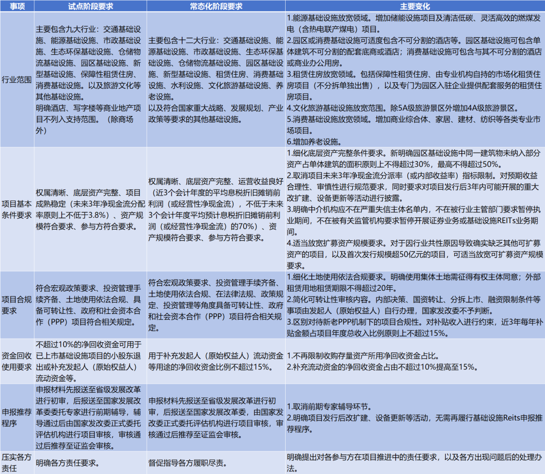 表2 基礎設施領域不動產投資信托基金(REITs)項目申報要求變化對比表