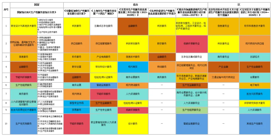 生產性服務業著重發展十大領域。2019年,國家統計局對《生產性服務業分類(2015)》進行修訂完善,印發《生產性服務業統計分類(2019)》,明確生產性服務業共有十大類,即研發設計與其他技術服務,貨物運輸、通用航空生產、倉儲和郵政快遞服務,信息服務,金融服務,節能與環保服務,生產性租賃服務,商務服務,人力資源管理與職業教育培訓服務,批發與貿易經紀代理服務,生產性支持服務。