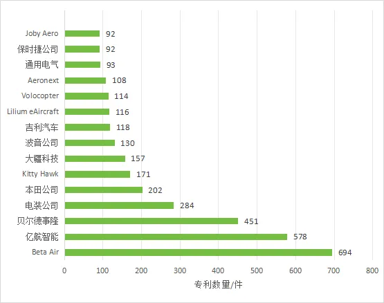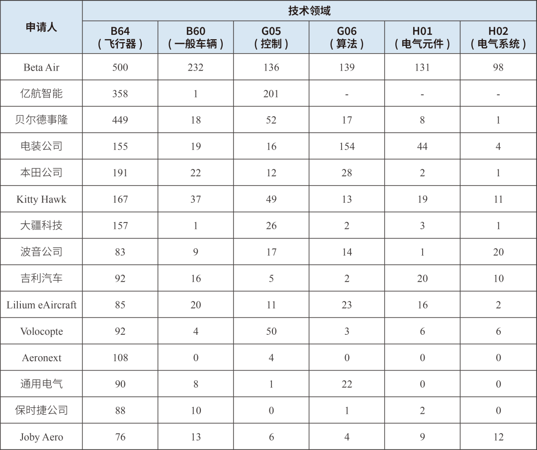 表1 全球重點申請人eVTOL領域專利技術布局(單位:件)