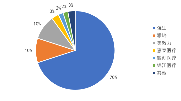 腦血管介入器械(又稱神經介入器械)是指治療中樞神經系統血管疾病的微創醫療器械。美敦力作為全球腦血管介入器械行業的引領者,進入中國市場20余年,以其全球領先的高技術產品占據國內60%市場份額。而國內品牌如微創神通、心瑋醫療、沛嘉醫療、歸創通橋等多以生產微導管類、微導絲類等通路類產品為主。