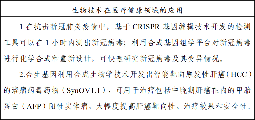 生物技術應用于醫療健康領域,大幅提高疾病預防與治愈水平、延長人類預期壽命。繼發現DNA雙螺旋結構和完成人類基因組破譯之后,基因重組技術、基因組編輯技術、基因檢測技術等醫藥生物技術不斷取得新的重大突破,從基因工程蛋白藥物——重組人胰島素開始,圍繞心血管疾病、糖尿病、慢性呼吸系統疾病、惡性腫瘤等重大慢性非傳染性疾病以及部分重大難治罕見病的治療需求,大批療效好、毒副作用小的生物工程藥物被陸續研發出來并加速應用,如抗腫瘤靶向藥物、表皮生長因子多肽類藥物、免疫細胞治療藥物等,大大提高疾病治愈率,提升人們健康水平。大批簡單易操作、靈敏度高、特異性強的體外診斷產品廣泛應用,如腫瘤基因靶向檢測試劑盒、新冠抗原檢測試劑盒、新生兒基礎篩查試劑盒等,大力助力腫瘤、新生兒遺傳病等重大疾病、傳染性疾病的早期篩查,進一步提升疾病的干預、治療水平。基因工程乙肝疫苗、肺炎疫苗、宮頸癌疫苗等成為預防和控制傳染病最經濟、最有效的手段。