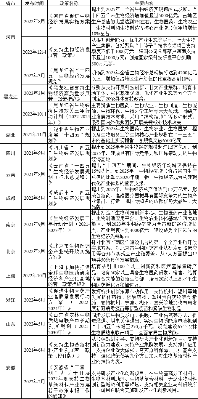 當前,發達國家和地區已將生物經濟視為再工業化和創造財富的重要手段和經濟戰略,紛紛在新的發展戰略中加強對生物經濟的布局。國家發改委于2022年5月發布《“十四五”生物經濟發展規劃》,成為國家首次把生物經濟作為獨立經濟形態進行部署的規劃,標志著生物經濟將成為今后一段時期我國科技和經濟戰略的重要內容,加快發展生物經濟已成為“十四五”時期各地搶先布局的重點。