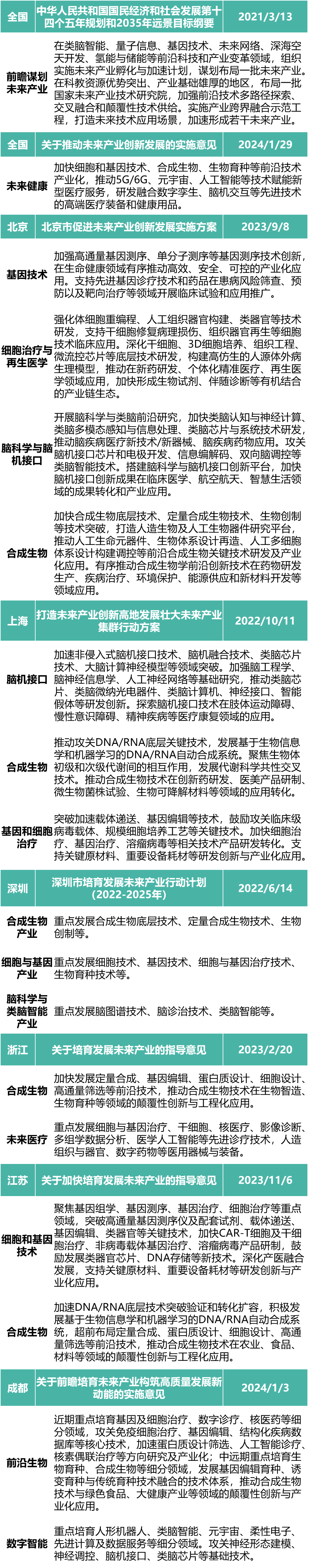 自國家“十四五”規劃綱要提出要前瞻謀劃未來產業以來,各地高度重視并加快未來產業的系統謀劃與前瞻布局。北京、上海、成都、浙江、江蘇等地陸續出臺了相關指導意見、行動方案(詳見附表)。圍繞未來健康產業,均提出了要加快布局細胞與基因治療、合成生物學等領域新賽道。部署重點領域情況如下: