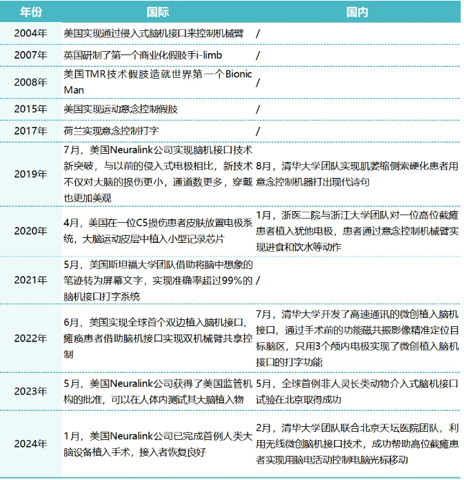 腦機(jī)接口在醫(yī)療領(lǐng)域的應(yīng)用是其發(fā)展的第一推動(dòng)力,目前主要經(jīng)歷了概念探索、科學(xué)論證和臨床應(yīng)用3個(gè)階段。1924年,腦電波的首次發(fā)現(xiàn)為大腦研究奠定了基礎(chǔ)。1970年,美國(guó)組建團(tuán)隊(duì)開(kāi)始進(jìn)行腦機(jī)接口相關(guān)研究,各國(guó)團(tuán)隊(duì)也相繼開(kāi)展探索,實(shí)現(xiàn)了刺激范式、腦機(jī)連接等技術(shù)突破。進(jìn)入21世紀(jì)后,隨著科學(xué)論證的不斷完善、神經(jīng)科學(xué)與相關(guān)技術(shù)的不斷突破,各國(guó)紛紛開(kāi)展腦機(jī)接口的戰(zhàn)略布局,侵入式BCI技術(shù)和非侵入式BCI技術(shù)都有了較大的進(jìn)展,如2004年實(shí)現(xiàn)了通過(guò)侵入式腦機(jī)接口控制機(jī)械臂,2019年非侵入式解碼器將大腦信號(hào)轉(zhuǎn)化為語(yǔ)音信號(hào)。相關(guān)專利量、論文發(fā)表量呈現(xiàn)爆發(fā)性增長(zhǎng),涌現(xiàn)了Neuralink等一批初創(chuàng)公司,概念應(yīng)用產(chǎn)品相繼推出。此外,隨著認(rèn)知/協(xié)同BCI等新范式的不斷涌現(xiàn),其應(yīng)用也從臨床醫(yī)學(xué)向娛樂(lè)游戲、汽車(chē)等多元化領(lǐng)域拓展,逐漸形成產(chǎn)業(yè)化趨勢(shì)。