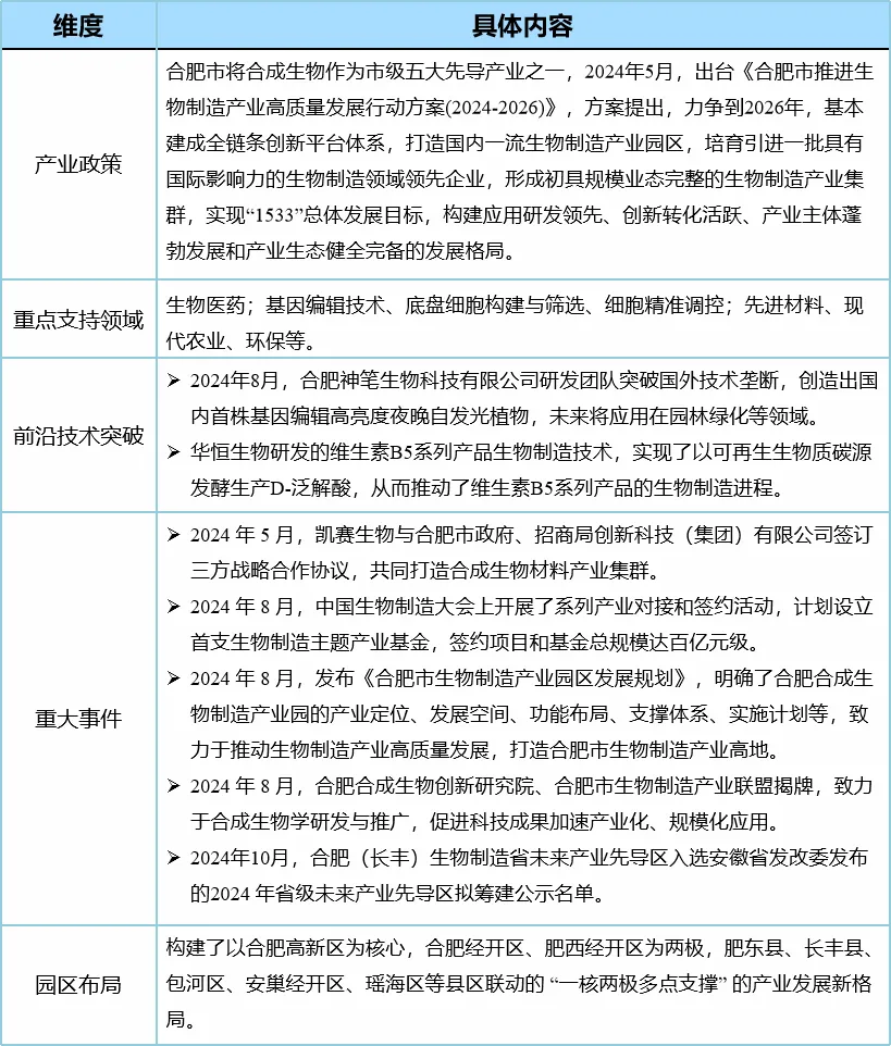 合成生物在國內多個重點省市均取得了顯著進展,尤其是北京、上海、天津、深圳、合肥等地區紛紛立足自身資源和優勢,在資金支持、科研團隊、產業集聚等方面均表現出較強的引領性和影響力,在強化政策引領的同時,多舉措、多維度促進合成生物產業發展,加快培育合成生物新質生產力,為我國合成生物產業的持續發展提供有力支撐。