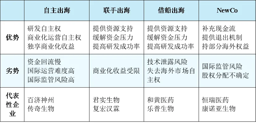與海外醫(yī)藥市場相比較,我國本土支付能力和定價空間有限,企業(yè)利潤回報相對較少,倒逼企業(yè)尋求海外市場盈利空間。同時,我國創(chuàng)新藥企自主研發(fā)實力逐漸與國際領先水平接軌,截至目前,我國創(chuàng)新藥臨床試驗和上市數(shù)量穩(wěn)居全球第二,CAR-T、ADC、siRNA以及PD-1/PD-L1等尖端領域表現(xiàn)亮眼,超30款創(chuàng)新藥成功出海,創(chuàng)新藥產(chǎn)業(yè)格局從“輸入”轉變?yōu)?ldquo;輸出”。在這一過程中,本土藥企從戰(zhàn)略布局、資本實力及海外商業(yè)化運營能力等多方面綜合考慮,探索形成了自主出海、聯(lián)手出海、借船出海、NewCo等多樣化模式,全面走向全球市場。