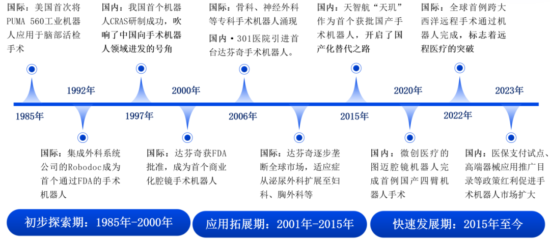 從行業(yè)發(fā)展生命周期角度看,手術(shù)機器人歷經(jīng)了早期探索、應(yīng)用拓展、快速發(fā)展三個主要時期。