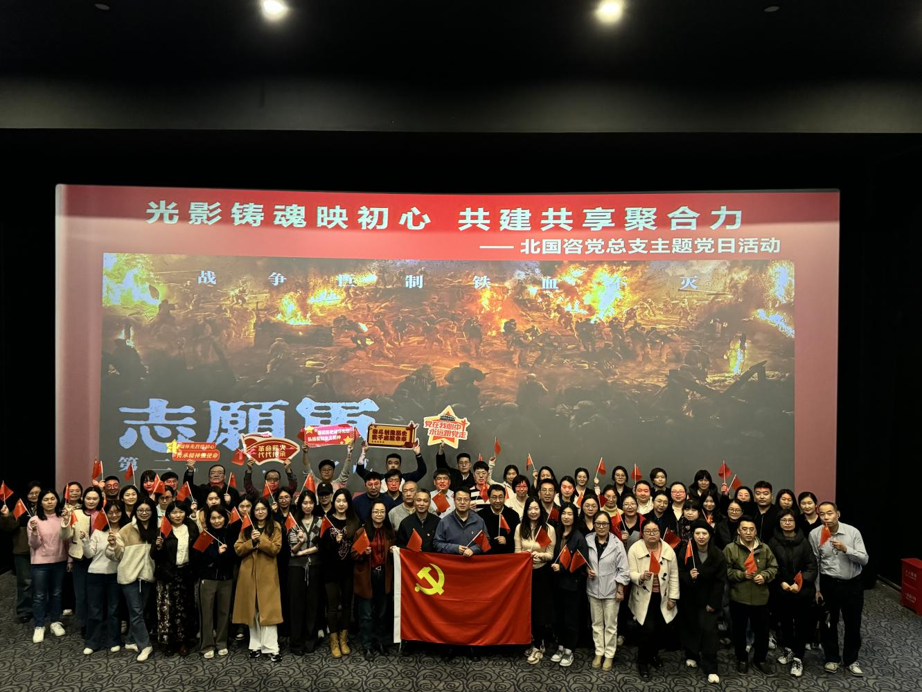 2024年11月18日下午,北國咨黨總支開展“光影鑄魂映初心 共建共享聚合力”主題黨日活動,組織下屬三個支部黨員及入黨積極分子觀看紅色影片。此次活動旨在通過觀影學習,持續不斷深入學習貫徹黨的二十大精神,厚植愛國情懷,激發黨員干部的責任擔當,進一步促進支部間的共建共享、聚力合力。