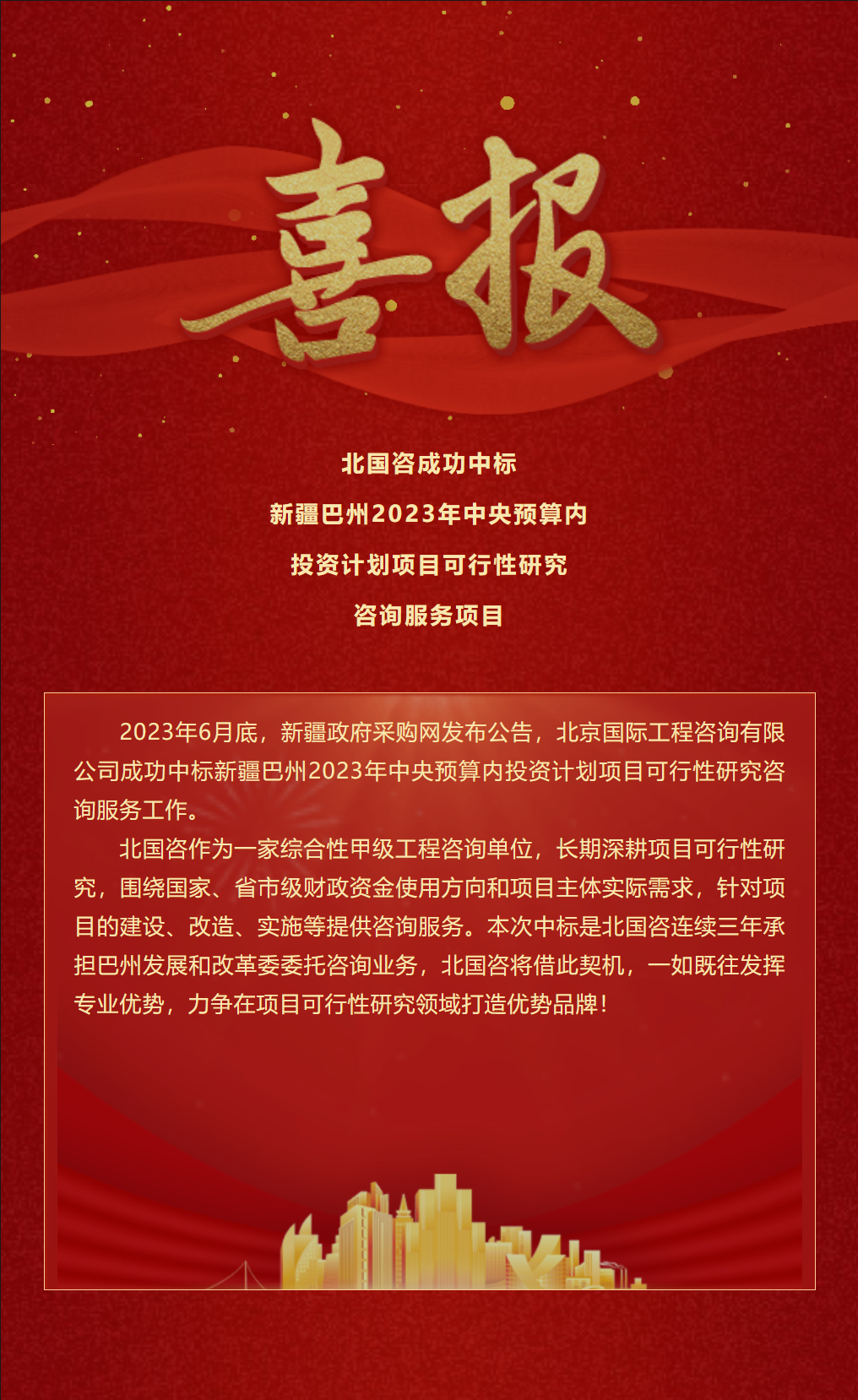 北國咨成功中標新疆巴州2023年中央預算內投資計劃項目可行性研究咨詢服務項目