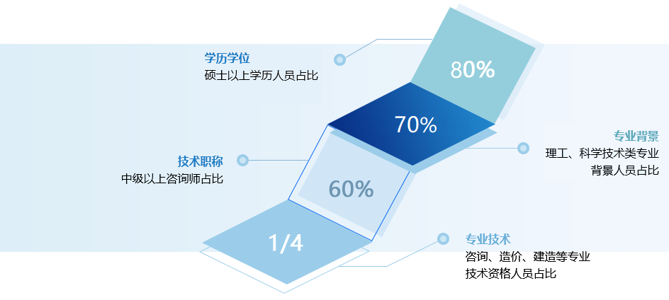 公司為國家高新技術企業,具有雄厚的咨詢技術服務力量,現有員工270余人,其中碩士及以上學歷占80%以上,理工、科學技術類專業背景人員占比近70%。